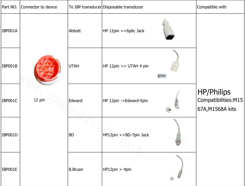 IBP001A :HP Compatible -Appott IBP Adaptador cable,10ft,Hp12pin >>6p6c Jack IBP001B :HP Compatible -CABLE ADAPTADOR IBP UTAH, HP 12pin >> DE UTAH 4 pin IBP001C: cable adaptador HP Compatible-Edward IBP, HP 12pin ->Edward-5pin IBP001D :HP Compatible -BD IBP cable adaptador, Hp12pin >>BD-7pin Jack IBP001E :HP Compatible -B.Bruan IBP Adaptador cable, Hp12pin > 4pin Compatibilitats : M1567A, kits M1568A